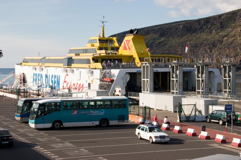 | Gomeralle matkustetaan isolla, monta kertaa päivässä liikennöivällä katamaraanilla Teneriffalta. Matka kestää vain 40 minuuttia. |