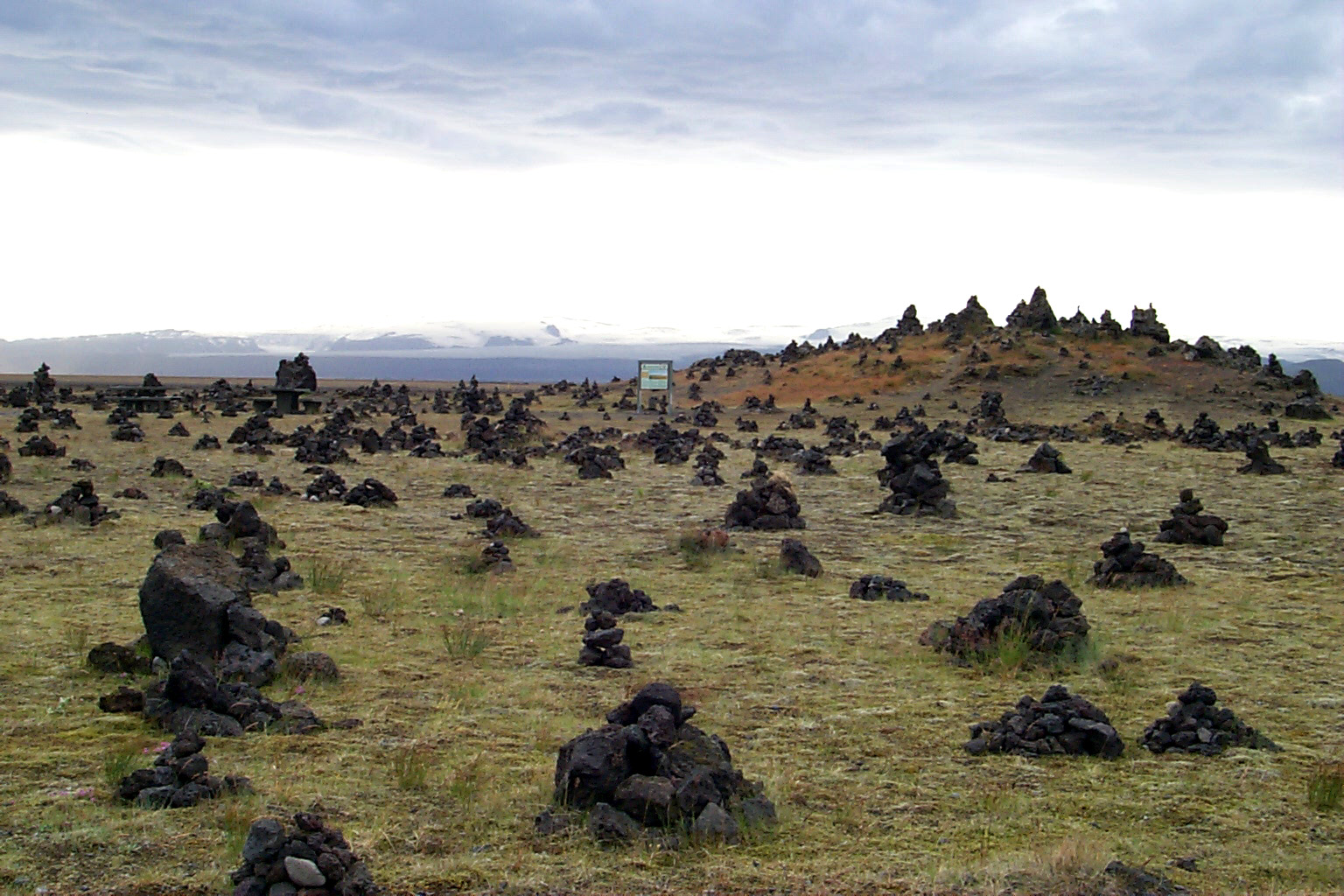 The lava field of Eldhraun. This place is near a highway rest stop and visitors have built these lava rock piles.  Wed, Aug 2, 2000 @ 16:18
